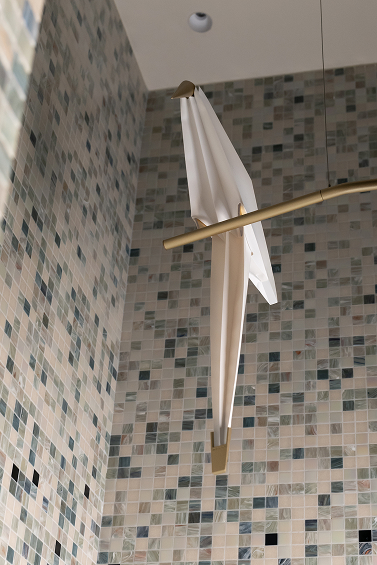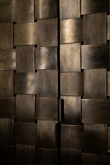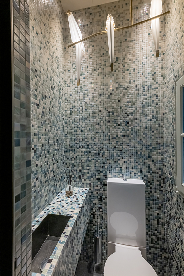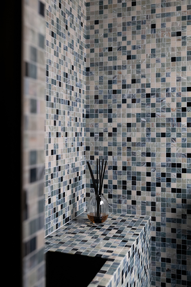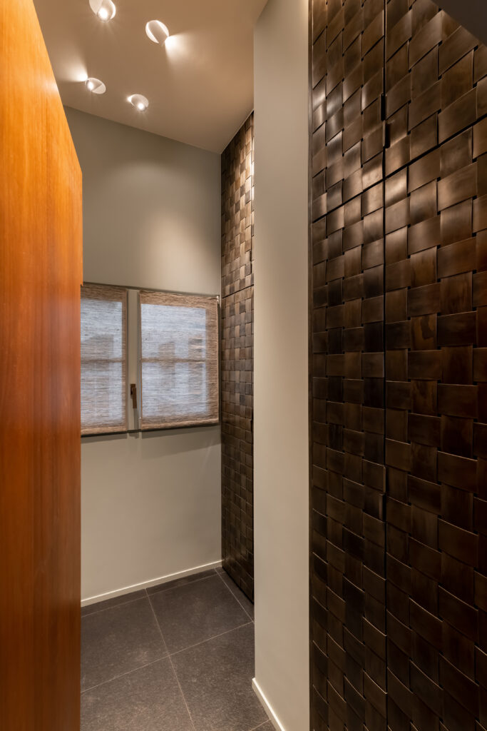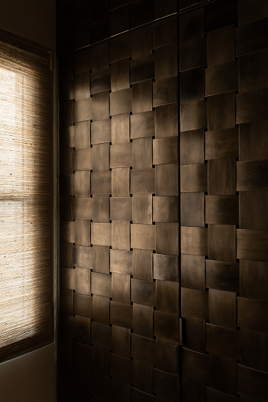 Mosaïque de verre, textiles en fibres naturelles, façades de rangement en acier tressé dans une finition bronze, radiateurs et luminaires contemporain.